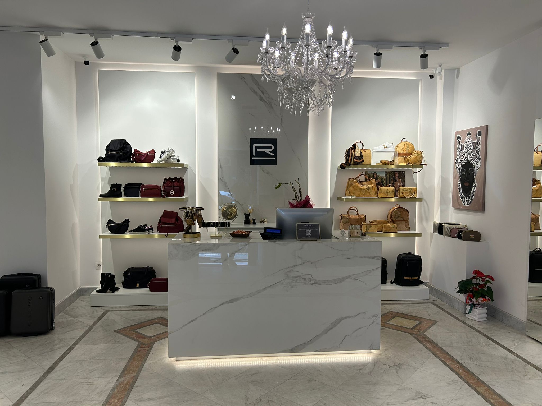 Un ambiente luminoso, sofisticato, con luci che valorizzano ogni prodotto, pavimenti in marmo, espositori moderni e raffinati, e chandelier che donano un tocco di classe senza tempo. Ogni angolo del negozio è stato pensato per accogliere, ispirare e far sentire ogni cliente protagonista del proprio stile.